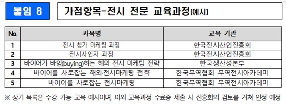 산업통상부 2026년 국내전시회 개최지원 대상사업 선정 관련, 본회 교육 수강 시 적용되는 가점을 아래와 같이 안내하오니 참고하시기 바랍니다.